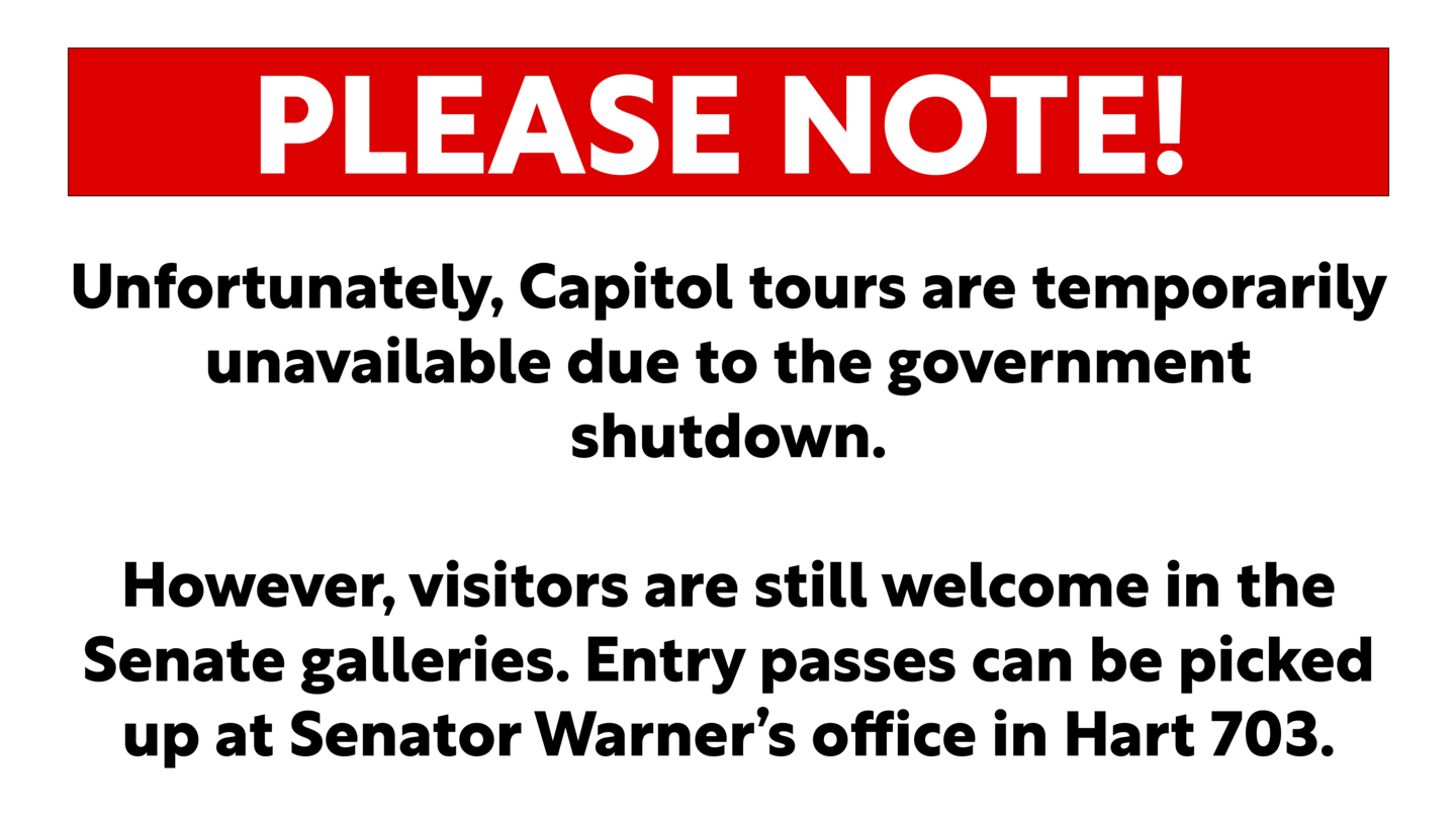 Staff-led tours can be requested for Virginia residents by emailing warner_tours@warner.senate.gov with your group size, address, and at least three options for dates.