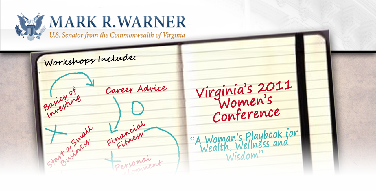 Senator Mark Warner and Old Dominion University are pleased to host the Virginia Women's Conference: A Woman’s Playbook for Wealth, Wellness, and Wisdom for Any Age on November 19, 2011. The conference will explore tools for success by providing advice from experts on health, careers, personal development, business, finance and retirement. It will feature a welcome from Senator Warner; Cathy Lewis, Executive Producer and Host of HearSay, WHRV FM; Old Dominion University President and Mrs. Broderick; and keynote remarks from U.S. Health and Human Services Secretary Kathleen Sebelius and Vernice “FlyGirl” Armour, America’s first African American female Combat Pilot. The conference will also include workshops, a Resource Expo, and networking opportunities.
